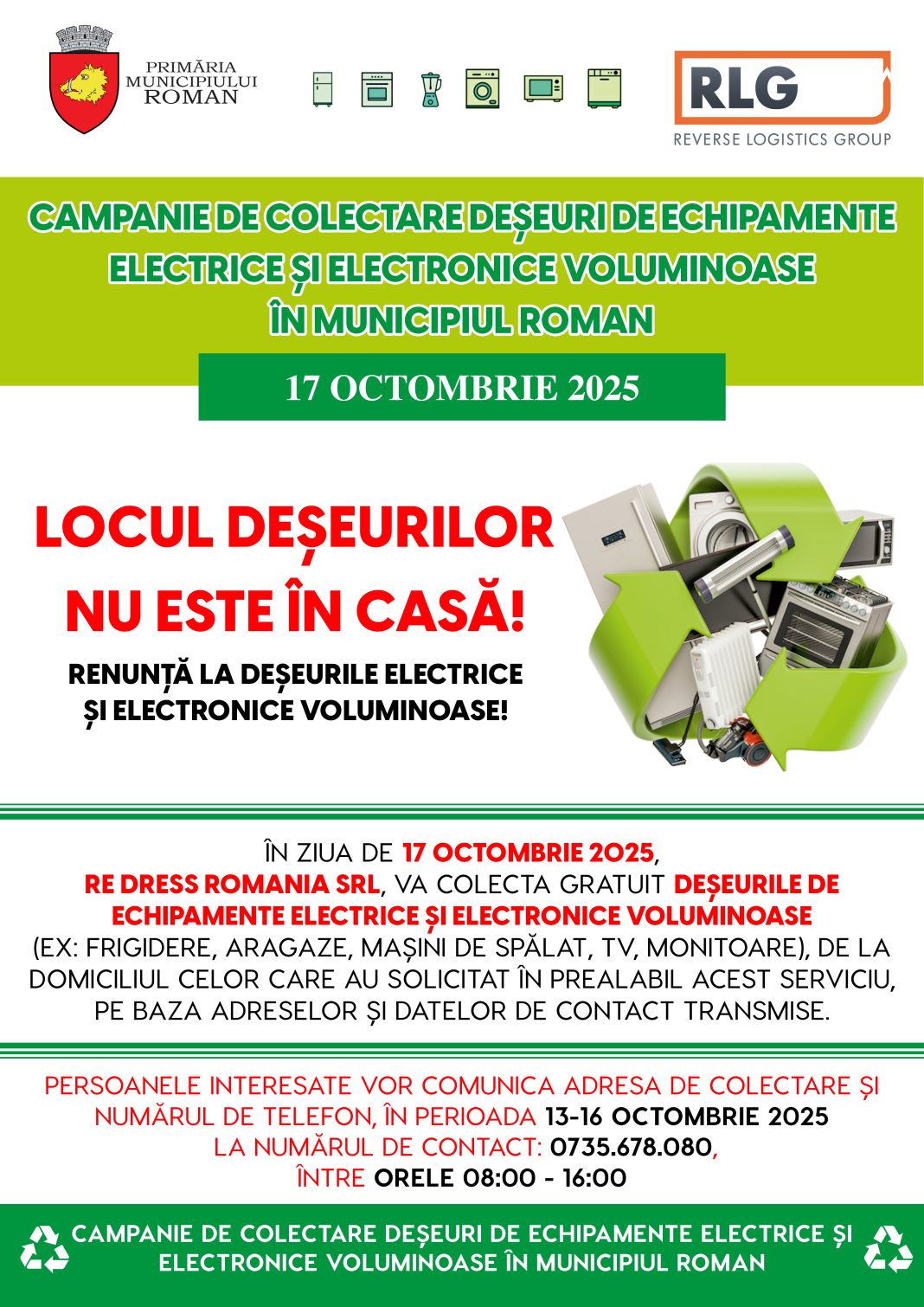 Acasă Anunturi Comunicate de presa 07.10.2025 – Anunț – colectare deșeuri de echipamente electrice și electronice în... Anunturi Comunicate de presaAnunțuri Mediu 07.10.2025 – Anunț – colectare deșeuri de echipamente electrice și electronice în Municipiul Roman în data de 17 OCTOMBRIE 2025 07/10/2025 18