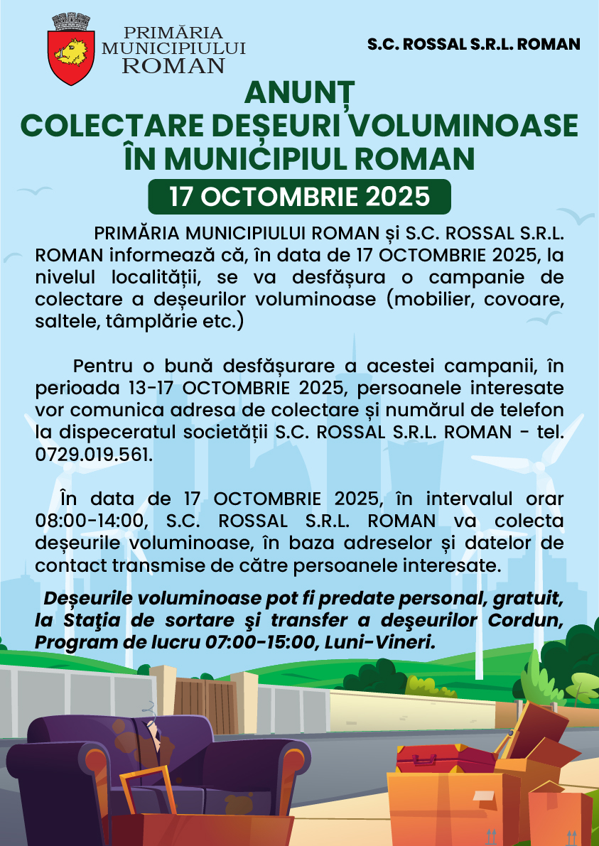 Acasă Anunturi Comunicate de presa 07.10.2025 – Anunț – colectare deșeuri voluminoase în Municipiul Roman în data... Anunturi Comunicate de presaAnunțuri Mediu 07.10.2025 – Anunț – colectare deșeuri voluminoase în Municipiul Roman în data de 17 OCTOMBRIE 2025 07/10/2025 16