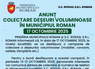 07.10.2025 – Anunț – colectare deșeuri voluminoase în Municipiul Roman în data de 17 OCTOMBRIE 2025